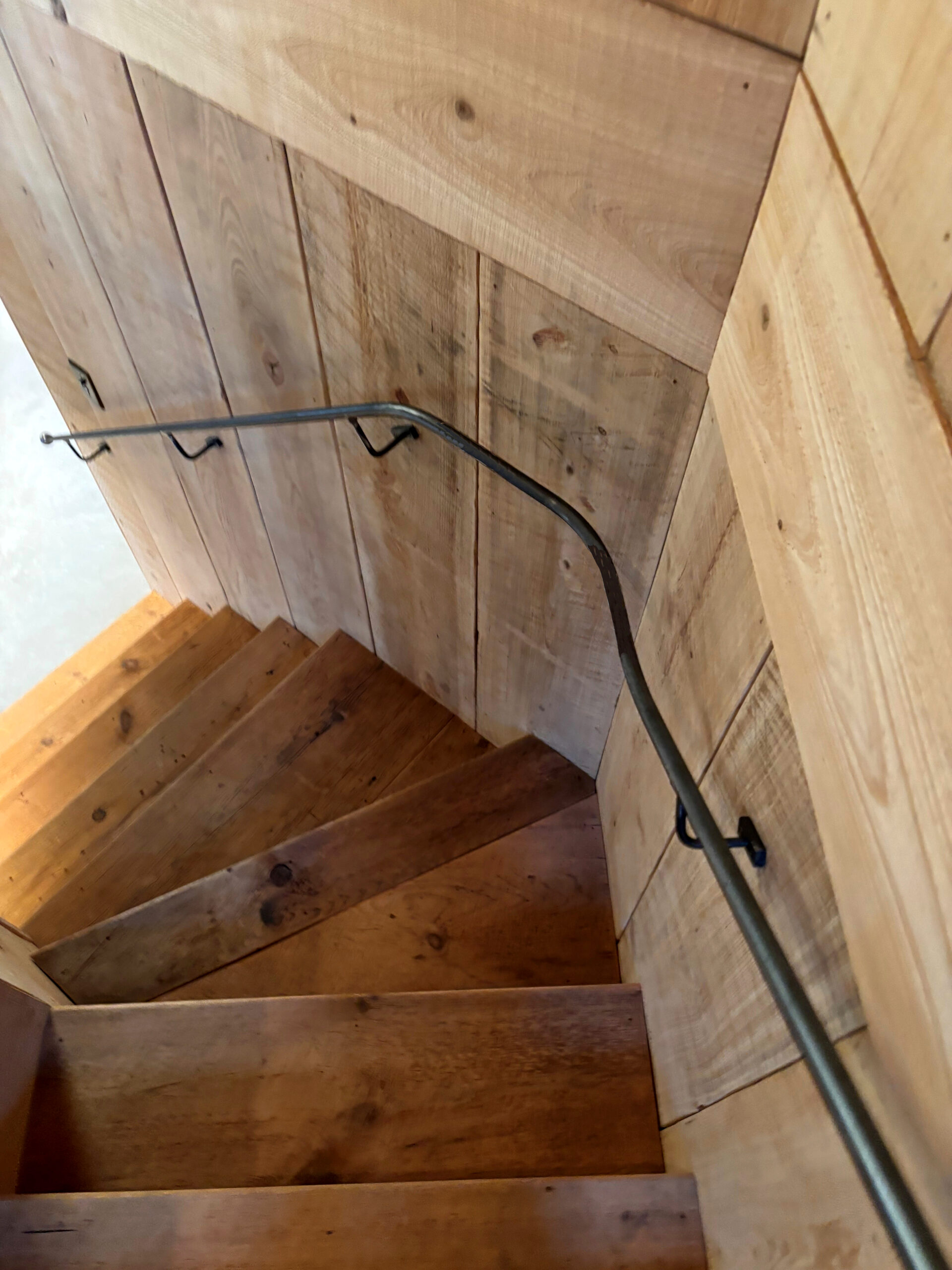 The handrail at the winding stair was field bent to the radius of the treads, cut to length, and finished on site prior to installation. The guard rail balusters and spindles were recessed into the wood floor to visually obscure this transition. The welds on the steel connections were ground smooth but left raw enough to communicate the hand crafted nature of the product.