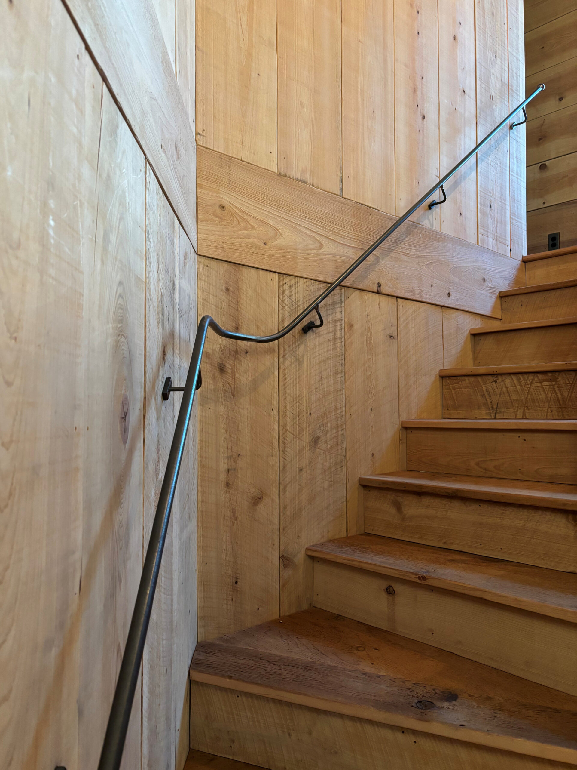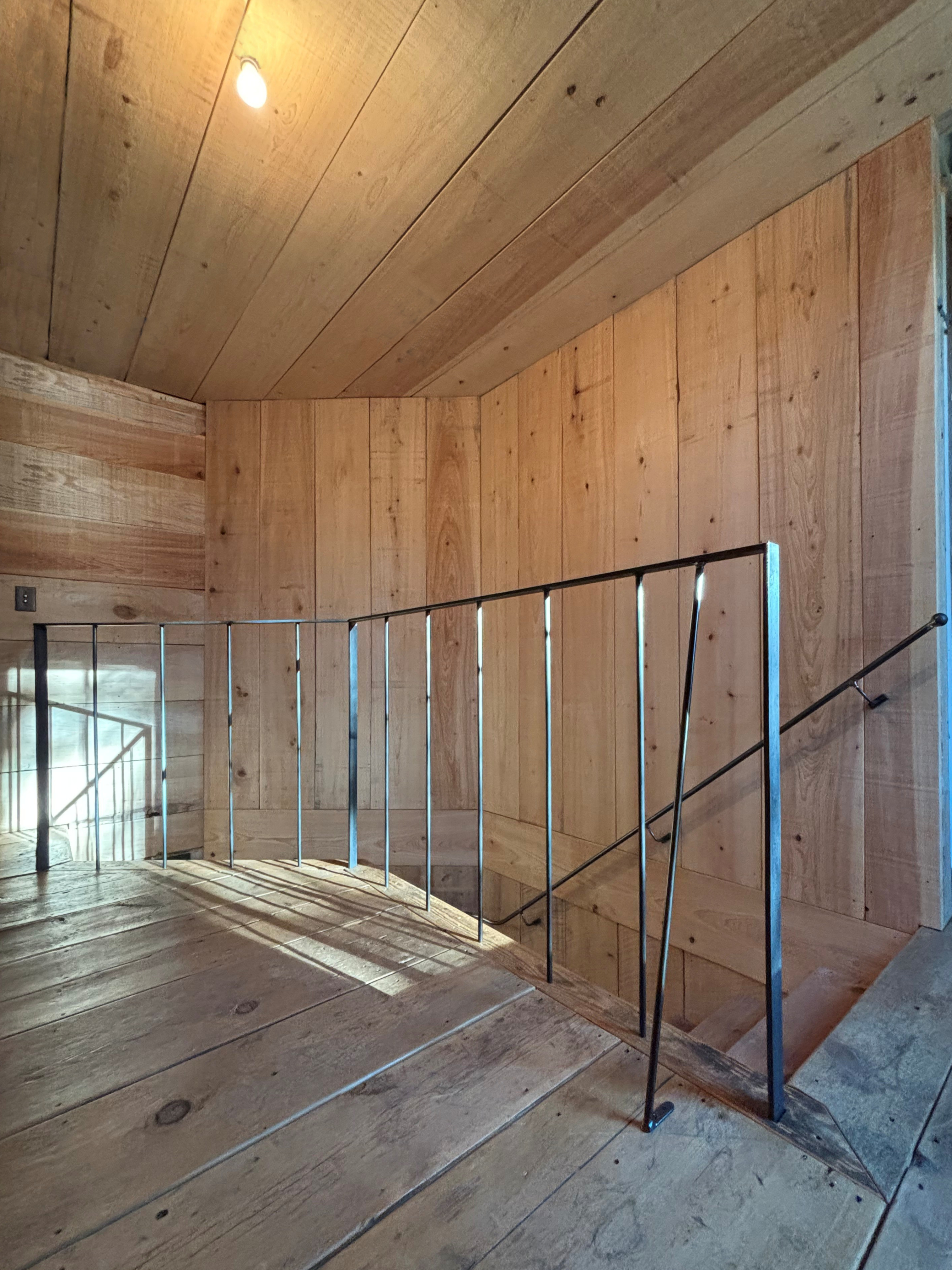 This project was fabricated for a client that recently converted an old barn frame into their new residence in Chadds Ford, PA. The original threshing floor boards were repurposed as the second floor finish material and a reclaimed cypress paneling clads the new winding stair, walls, and ceiling. The request for the design of these railings was that they have a very thin profile, be visually open, and have a near seamless integration with the rest of the modern yet rustic interior.