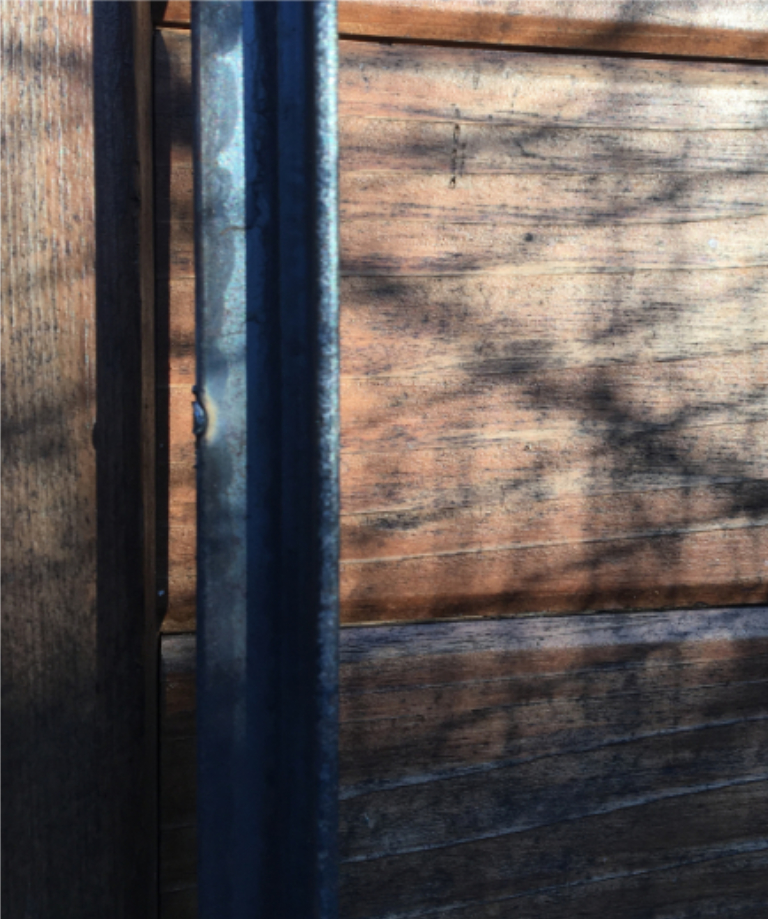 echoes the vertical geometry of the existing steel columns, the rest of the rail emphasis the horizontal patterns of the brick and wood decking. Care was taken to align the points of attachment with the grout lines of the existing brick coursing.