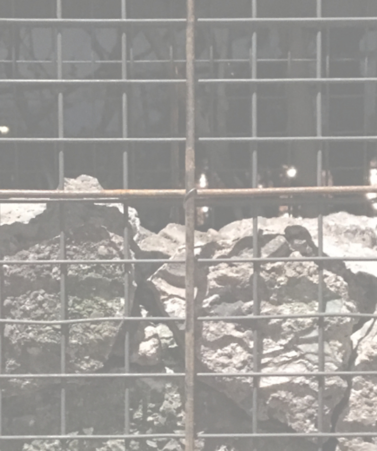 Our design features a 42 foot long steel frame spanning between concrete footings located at each vertical post. A 6×6 wire mesh was used to infill the vertical panels, which is overlaid with a 1×1 wire mesh at the bottom course to contain the concrete rubble salvaged from the demolition of the previous concrete patio.